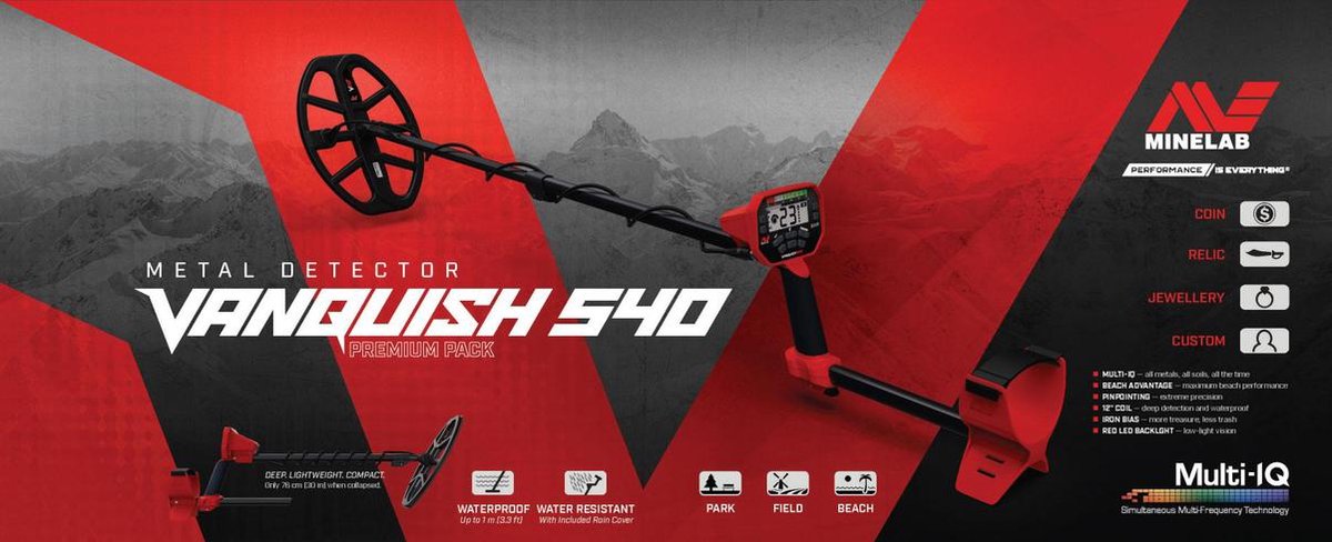 De Minelab VANQUISH 540 weegt slechts 1,3 kg en is compleet met spatwaterdicht bedieningspaneel. Dankzij de krachtige Multi-IQ technologie en intuïtieve functies haal je het maximale uit elke zoektocht. Of je nu een beginners bent die de wereld wil ontdekken, of een meer ervaren detectorliefhebber, deze detector biedt alles waarom je zoekt – kracht, controle en comfort in één apparaat.